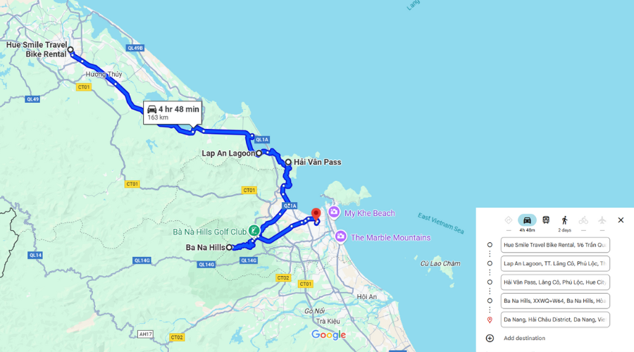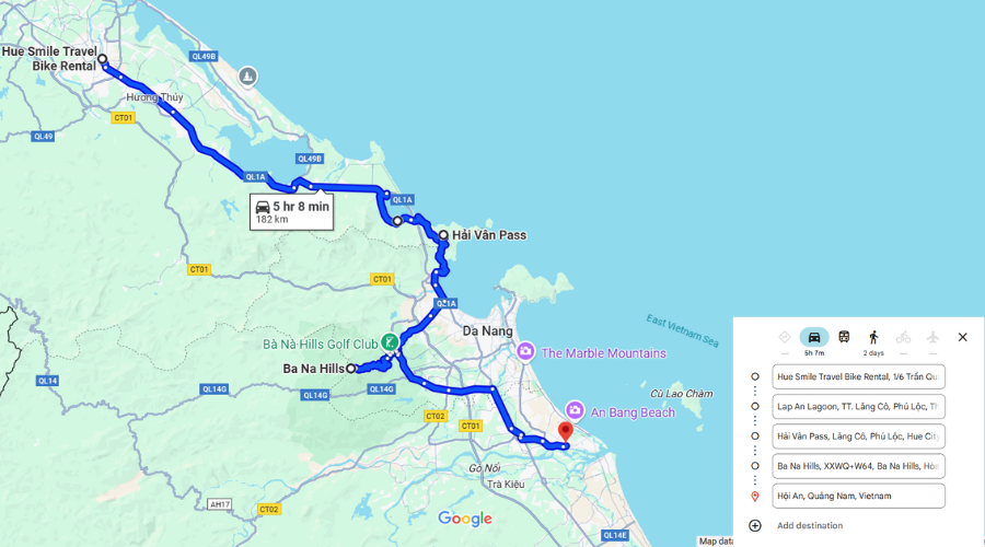 The journey typically takes around 5 hours, with planned stopovers including a brief stop at Ba Na Hills (no entrance ticket included). We will pick you up from your preferred location in Hue and drop you off at your desired destination in Da Nang or Hoi An. This is the ideal way to travel while enjoying the beautiful scenery without a fixed schedule.